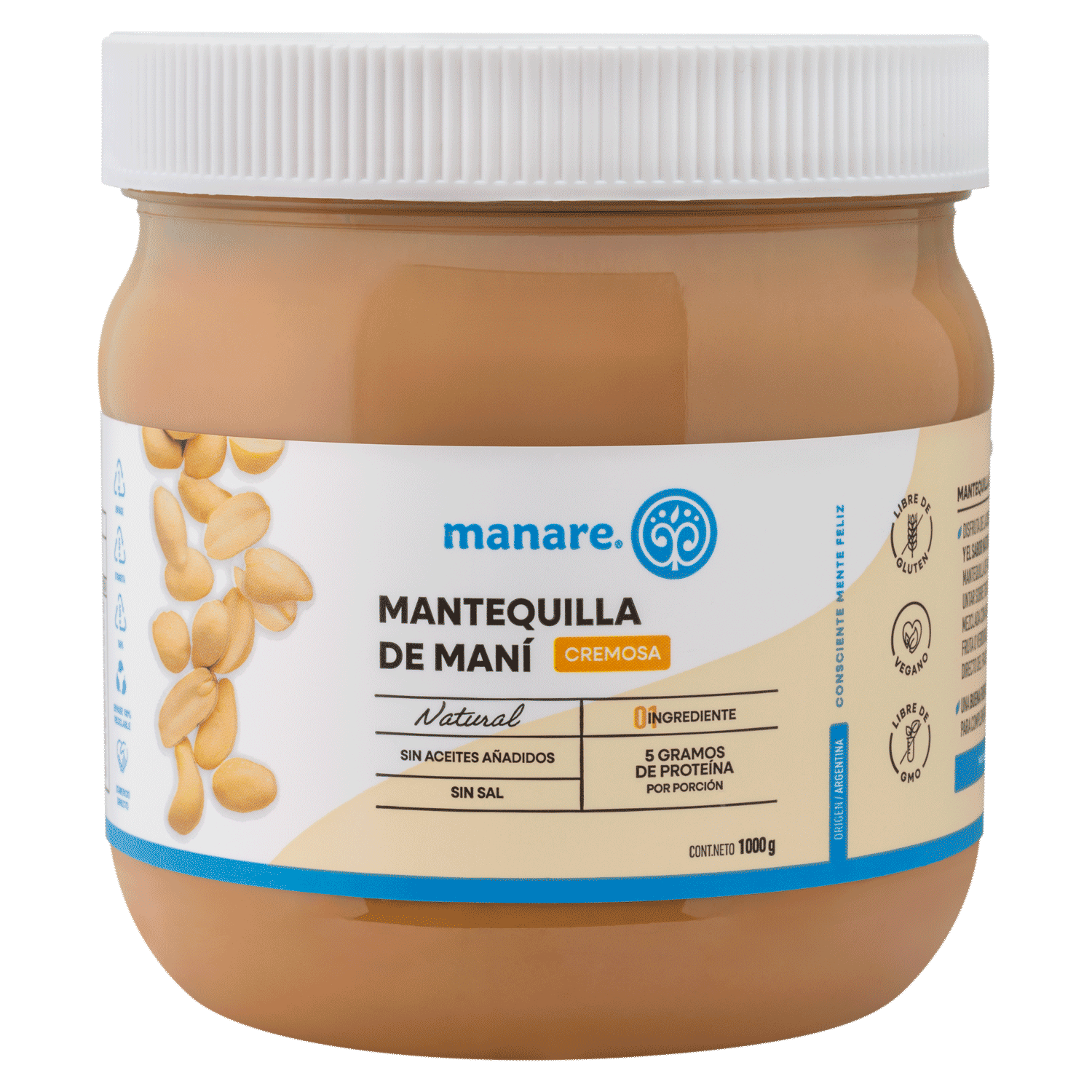 La Mantequilla de Maní Cremosa de Manare en formato de 1 Kg — el tamaño para hogares que la consumen a diario. Un solo ingrediente: maní 100%. Sin sal, sin azúcar, sin aceite de palma, sin emulsificantes. El mejor costo por gramo de la línea.