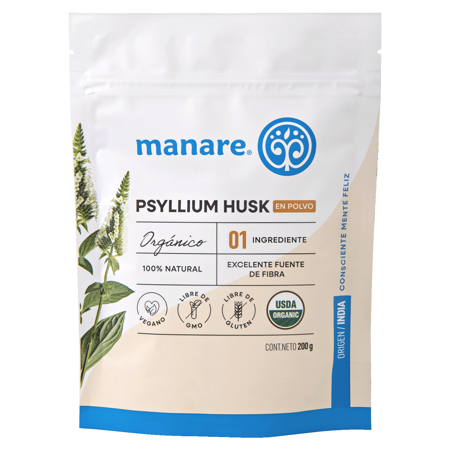 El Psyllium Husk de Manare es la cáscara de la semilla de Plantago ovata — la fuente de fibra soluble más concentrada disponible. Con un 70% de fibra soluble por peso, el psyllium forma un gel viscoso en contacto con el agua que actúa como prebiótico selectivo, regulador del tránsito intestinal y aglutinante natural en repostería sin gluten. Uno de los pocos ingredientes que simultáneamente es funcional en la cocina y beneficioso para el microbioma.