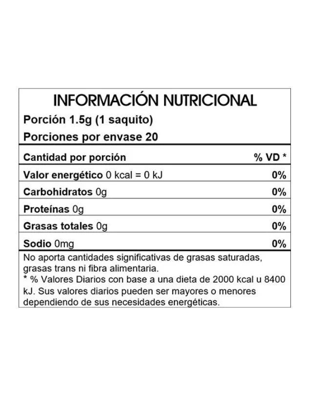 Estuche con 20 saquitos ensobrados. Peso neto 30g.